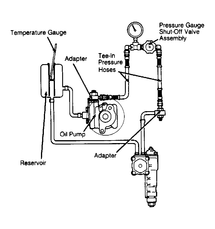 - Disconnect pressure hose from power steering pump. Connect in-line a pressure gauge and hoses capable of handling 300 psi (21 kg/cm2