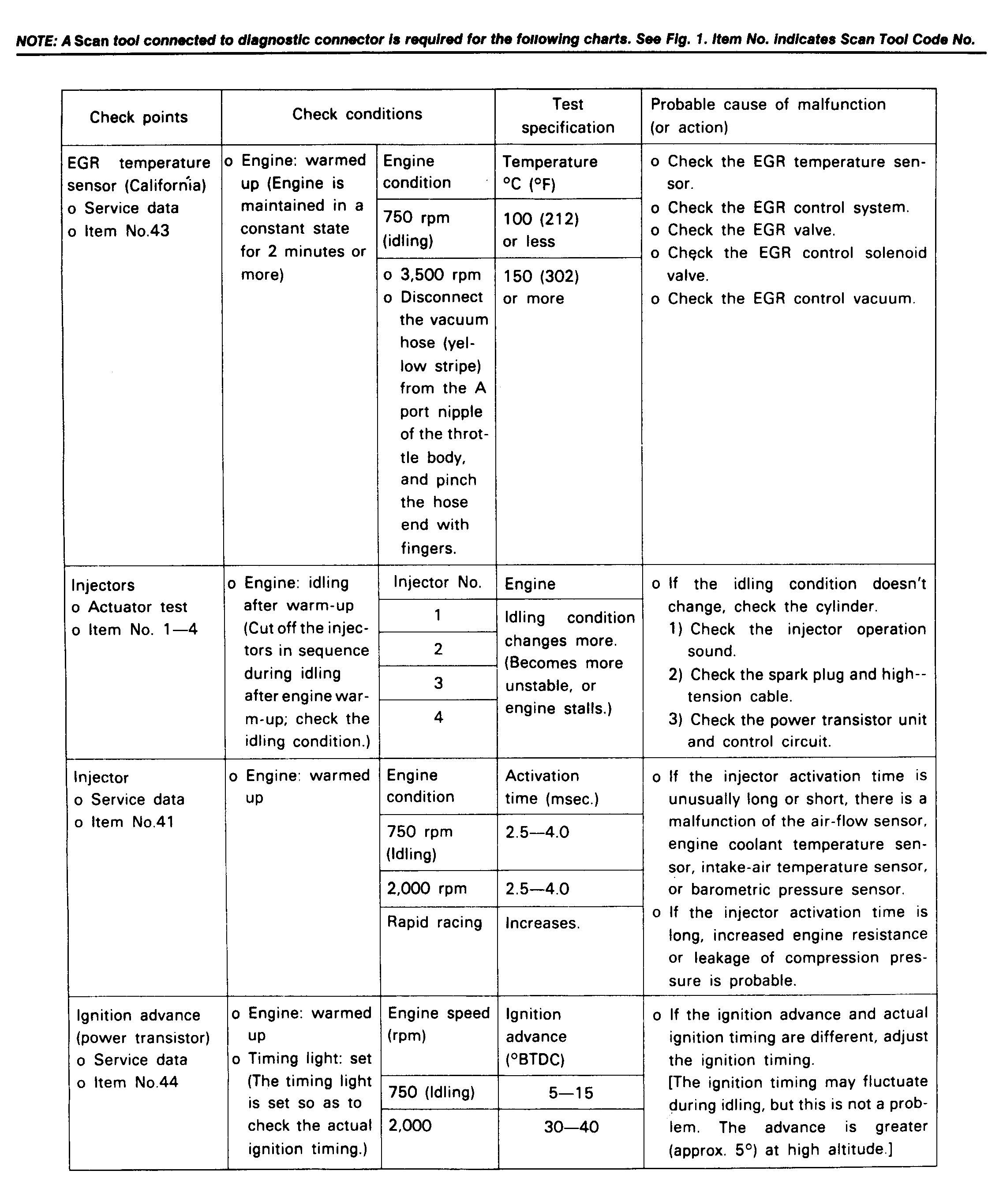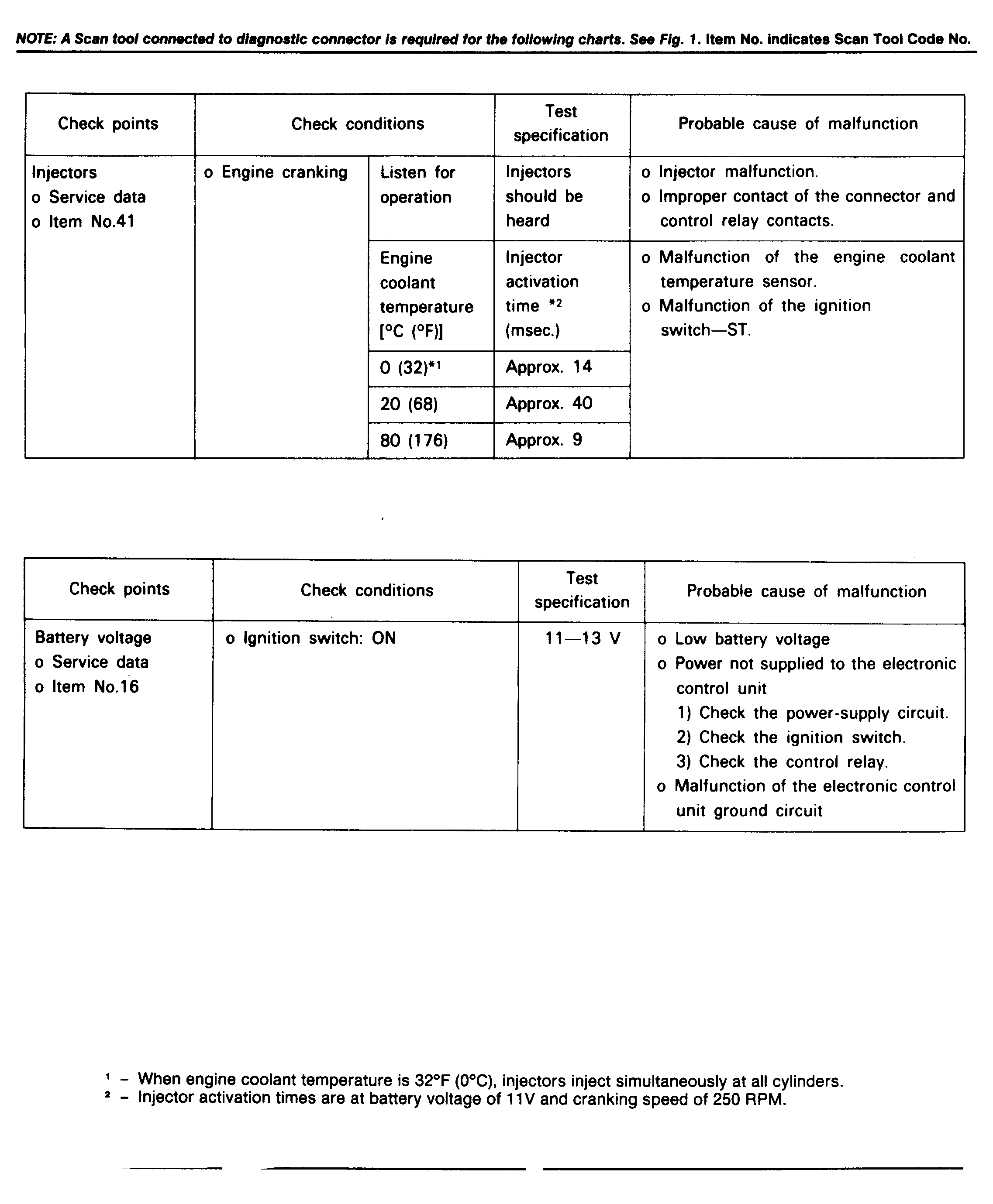 1. Turn ignition switch to OFF position. Connect either a voltmeter between MPI diagnostic terminal and ground terminal of diagnostic connector, or Multi-Use Tester (Scan Tool) (09391-33200 ) to diagnostic connector and cigarette lighter. See Fig 1 . Turn ignition switch to ON position and disclosure of ECU memory (fault codes) will begin.