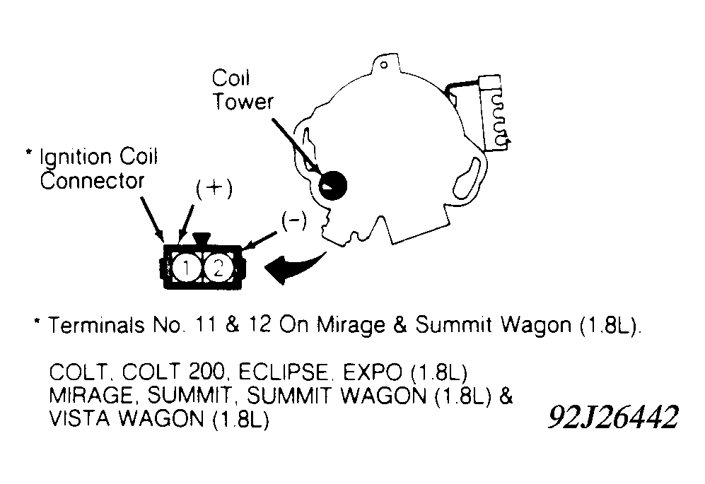Using a DVOM, measure primary coil resistance between positive and negative terminals of coil. See Fig 1 or Fig 2 . Measure secondary coil resistance between coil positive terminal and ignition coil tower. Primary and secondary coil resistance should be within specification. See IGNITION COIL RESISTANCE (OPTICAL) table.