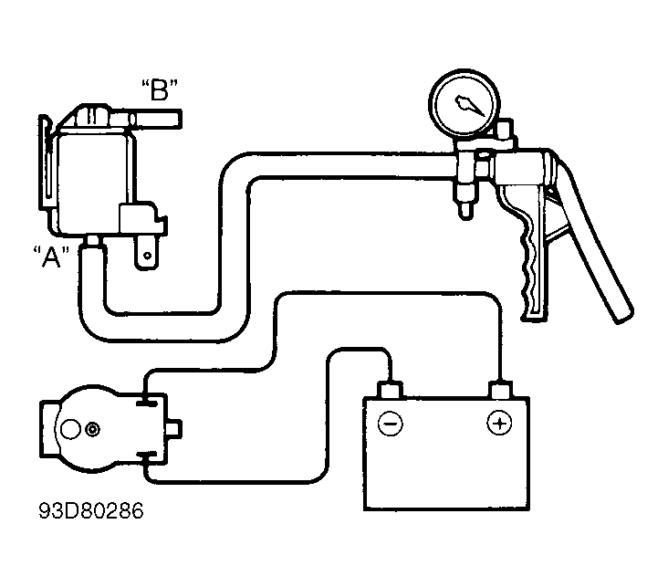 - Remove vacuum hoses from solenoid. Ensure solenoid harness connector is disconnected. Connect a vacuum pump to solenoid nipple "A". Use jumper wires to connect battery voltage to solenoid terminals. See Fig 1 . With vacuum applied, nipple "B" unplugged, and negative jumper wire connected, solenoid should hold vacuum.