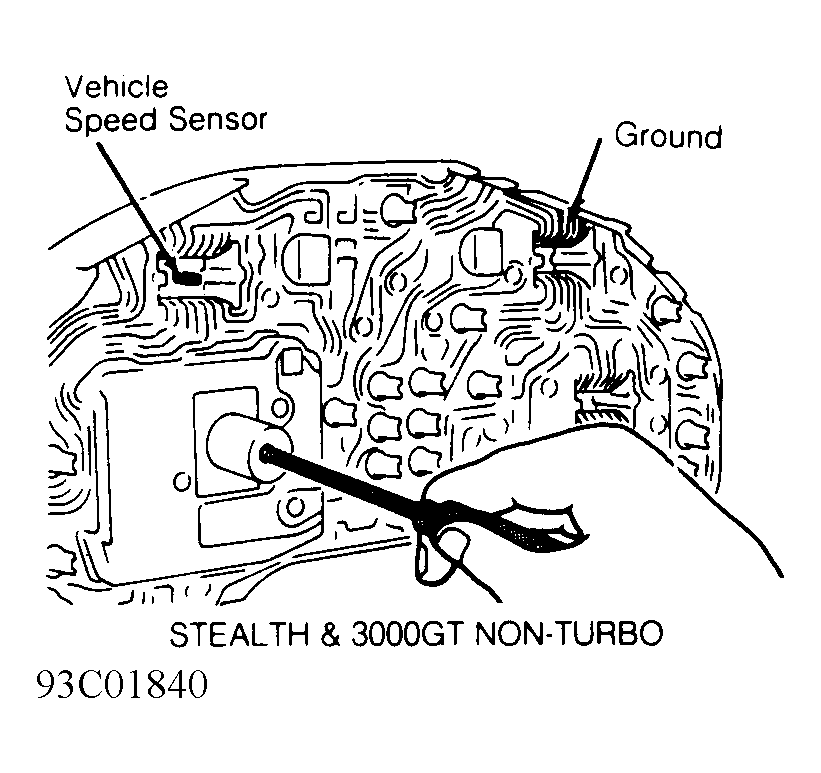 - VSS is located at end of speedometer cable in transmission. Remove VSS. Connect battery, resistor (3-10 ohms) and voltmeter to indicated terminals. See Fig 1 or Fig 2 . Ensure voltage pulses 4 times per speedometer shaft revolution. If voltage is not as specified, replace VSS. If voltage is as specified, go to next step.