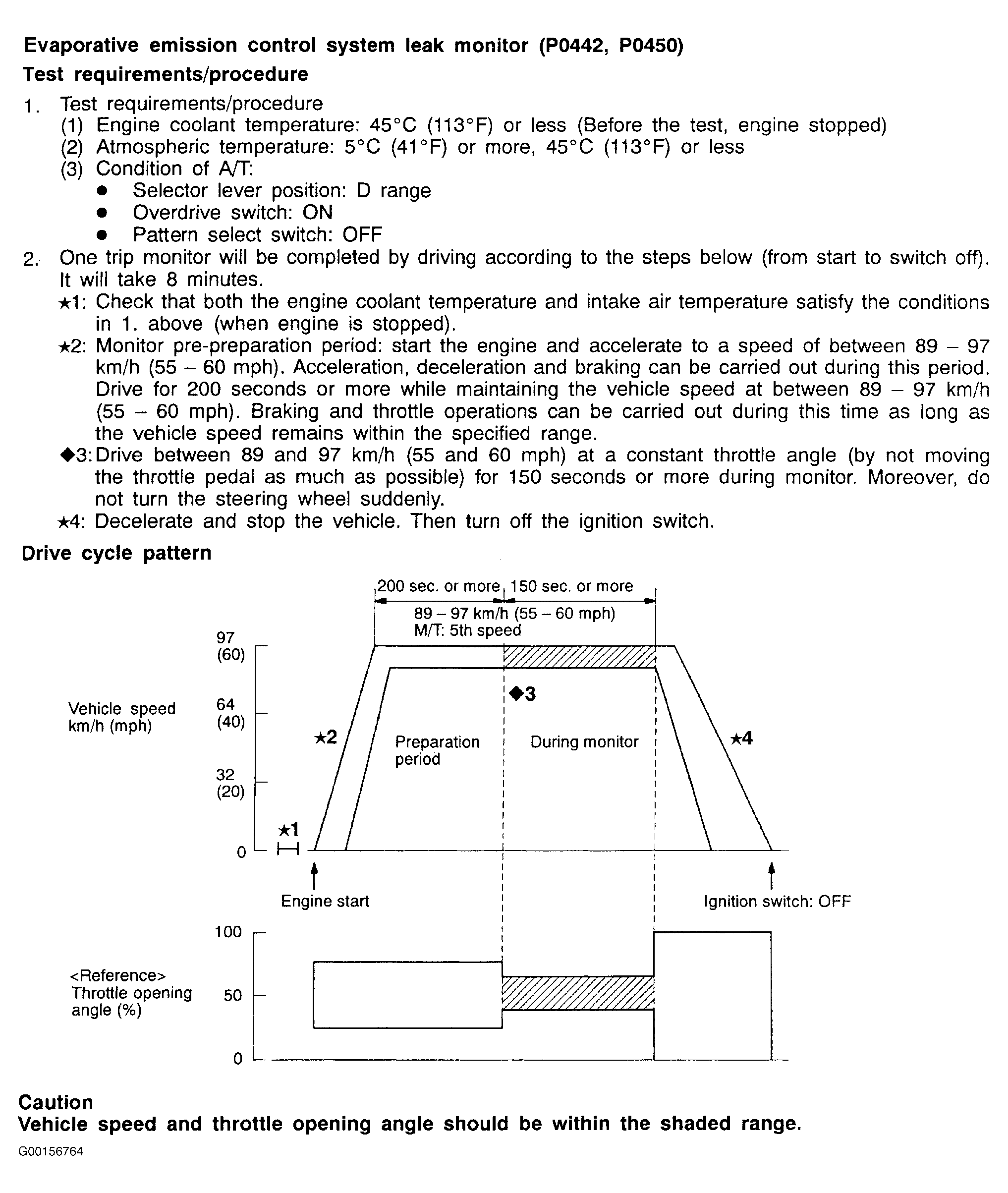 All kinds of diagnostic trouble codes can be monitored by carrying out a short drive according to the following six drive cycle pattern. In other words, doing such a drive allows to regenerate any kind of trouble which involves illuminating the Check Engine/Malfunction Indicator Lamp and to verify the repair procedures has eliminated the trouble (the Check Engine/Malfunction Indicator Lamp is no longer illuminated).