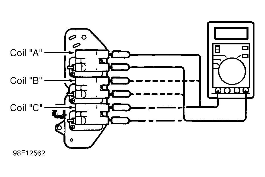 Using DVOM, measure primary coil resistance between terminal No. 3 (power terminal) and each individual coil terminal. See Fig 1. Terminal No. 1 controls coil "B", terminal No. 2 controls coil "A", and terminal No. 4 controls coil "C". See Fig 2. To check secondary coil resistance, measure resistance between towers of each individual coil. Replace coil if primary and secondary coil resistances are not within specification. See IGNITION COIL RESISTANCE (V6) table.IGNITION COIL RESISTANCE (V6) - Ohms @ 68°F (20°C)