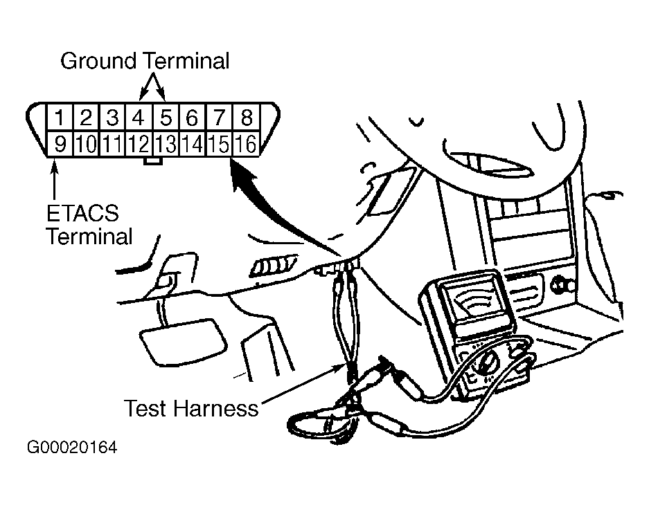 Using Diagnostic Trouble Code Check Harness (MB991529), connect voltmeter to Data Link Connector (DLC) terminal No. 9 (ETACS-ECU) and terminal No. 4 (ground) or No. 5 (ground). See Fig 1 . Operate indicated switches. See SWITCH INPUT SIGNAL REQUIREMENTS table. If switch input signal is received at DLC, voltmeter needle will fluctuate once. If switch input is not received at DLC, diagnose problem. See INPUT SIGNAL SYMPTOM TEST INDEX table.