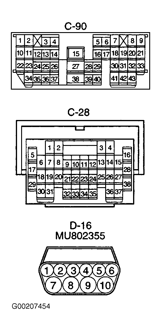 - Check connectors C-28, C-90, D-16 at intermediate connector and C-60 at ECM (M/T) or C-54 at PCM (A/T) for damage. See Figure, Figure or Figure . If the connectors are in good condition, go to next step, otherwise, repair or replace them and go to step 28.