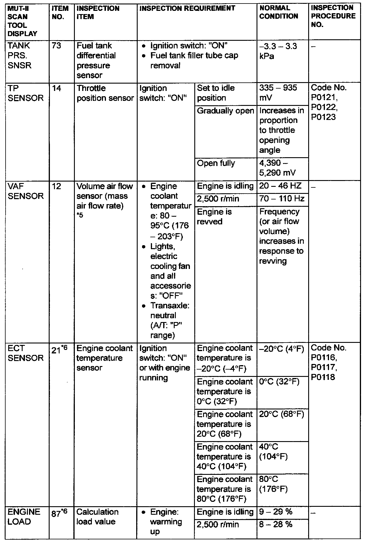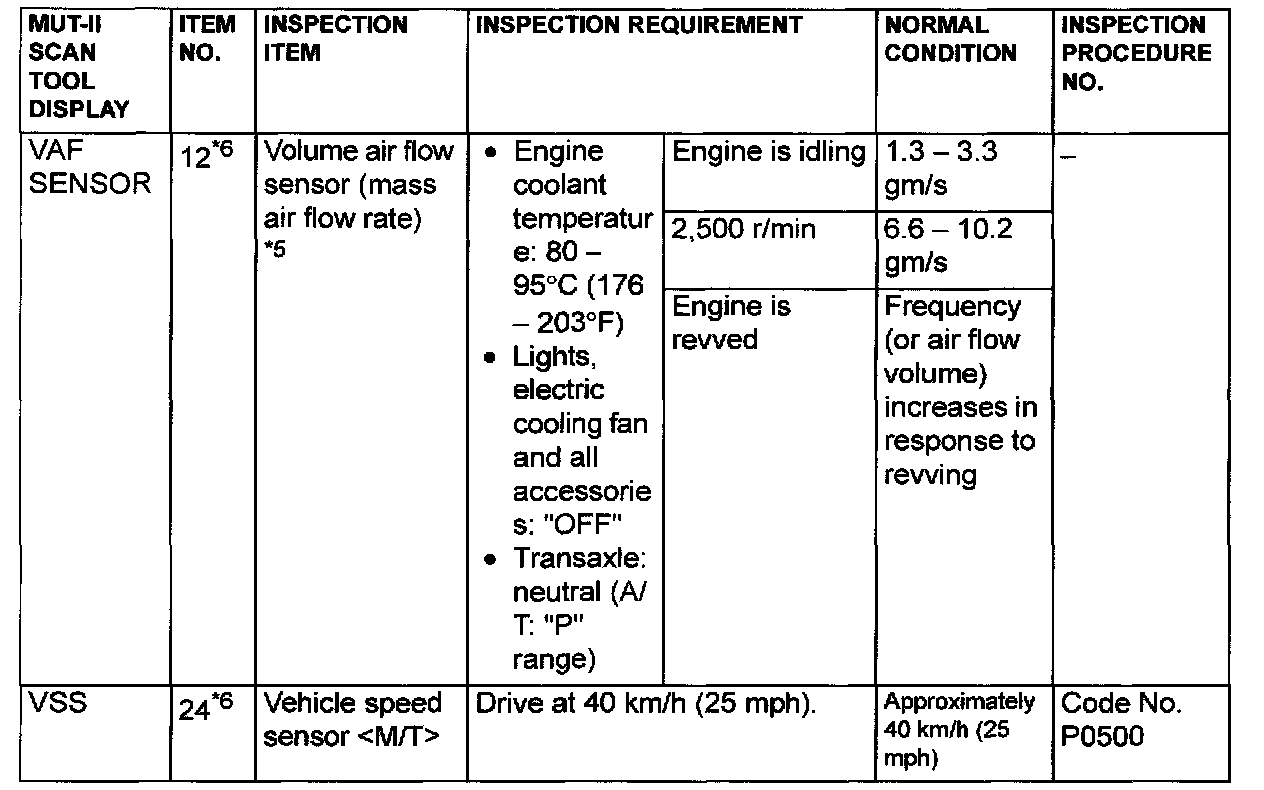 NOTE: *5: In a new vehicle [driven approximately 500 km (311 mile) or less], the volume air flow sensor output frequency is sometimes 10% higher than the standard frequency