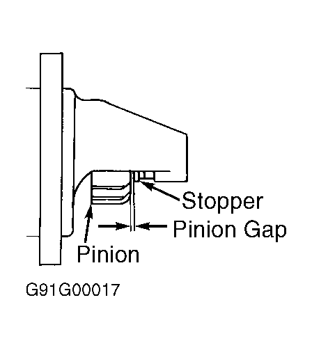- Connect a second jumper wire from negative battery terminal and touch terminal "M" of starter solenoid. Using a feeler gauge, measure clearance between pinion and stopper. See Fig 1