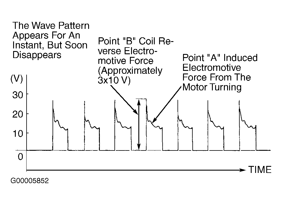 - Using test harness, or backprobing, connect lab scope pick-up, in turn, to IAC motor connector terminals No. 1, 3, 4, and 6. With engine running, compare IAC motor waveform to normal waveform. See Fig 1.
