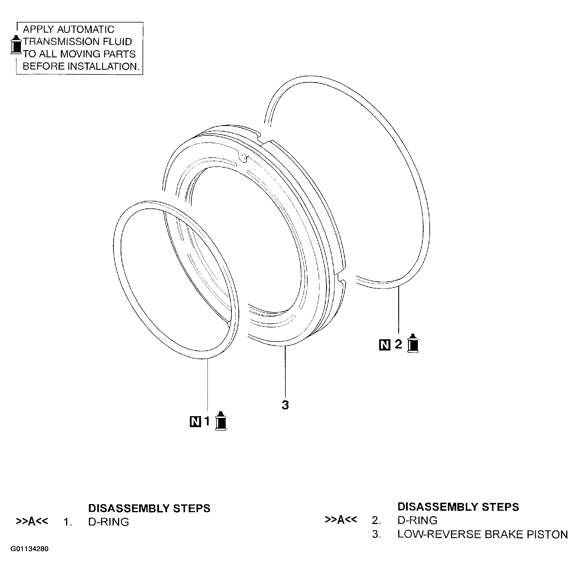 For low-revese brake disassembly procedures, follow numbered steps in illustration. See Fig 1. For low-reverse brake assembly procedures, follow numbers steps in illustration in reverse order. Letters in illustration refer to service point to observe while disassembling and assembling low-reverse brake. Letters with arrows pointing towards letter refer to service points to be observed while performing that step of the assembly procedure. See ASSEMBLY SERVICE POINT .
