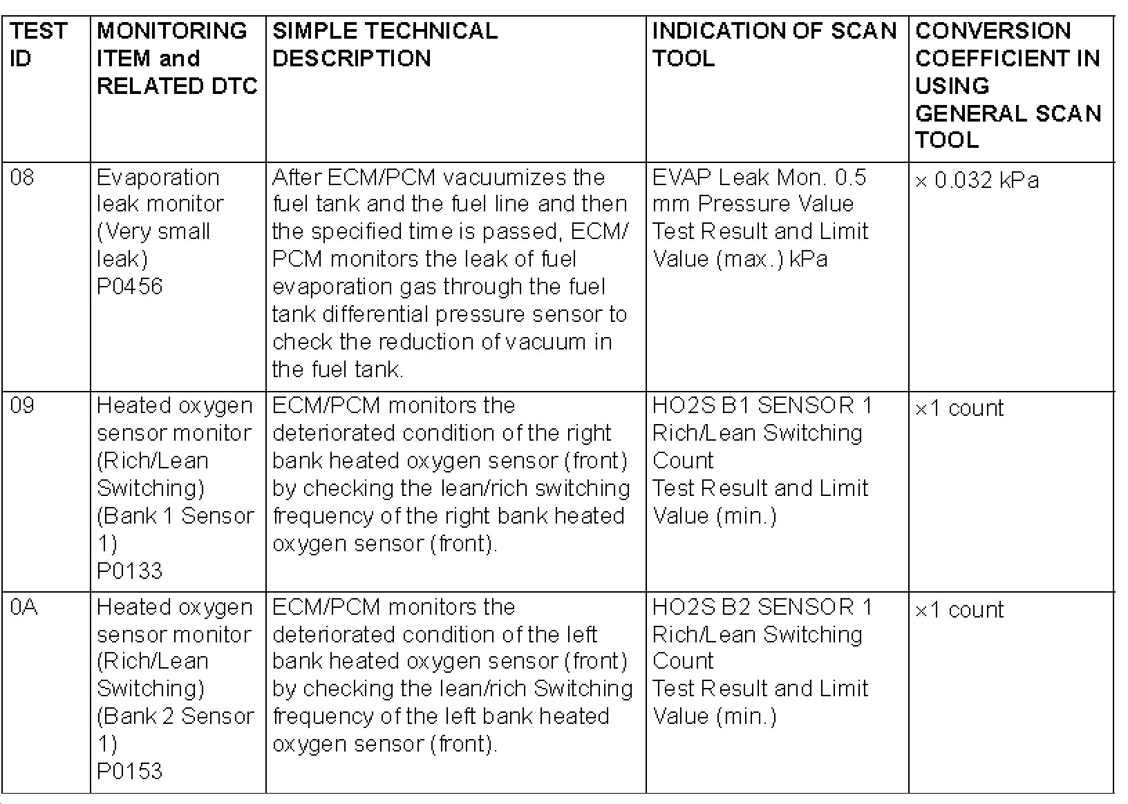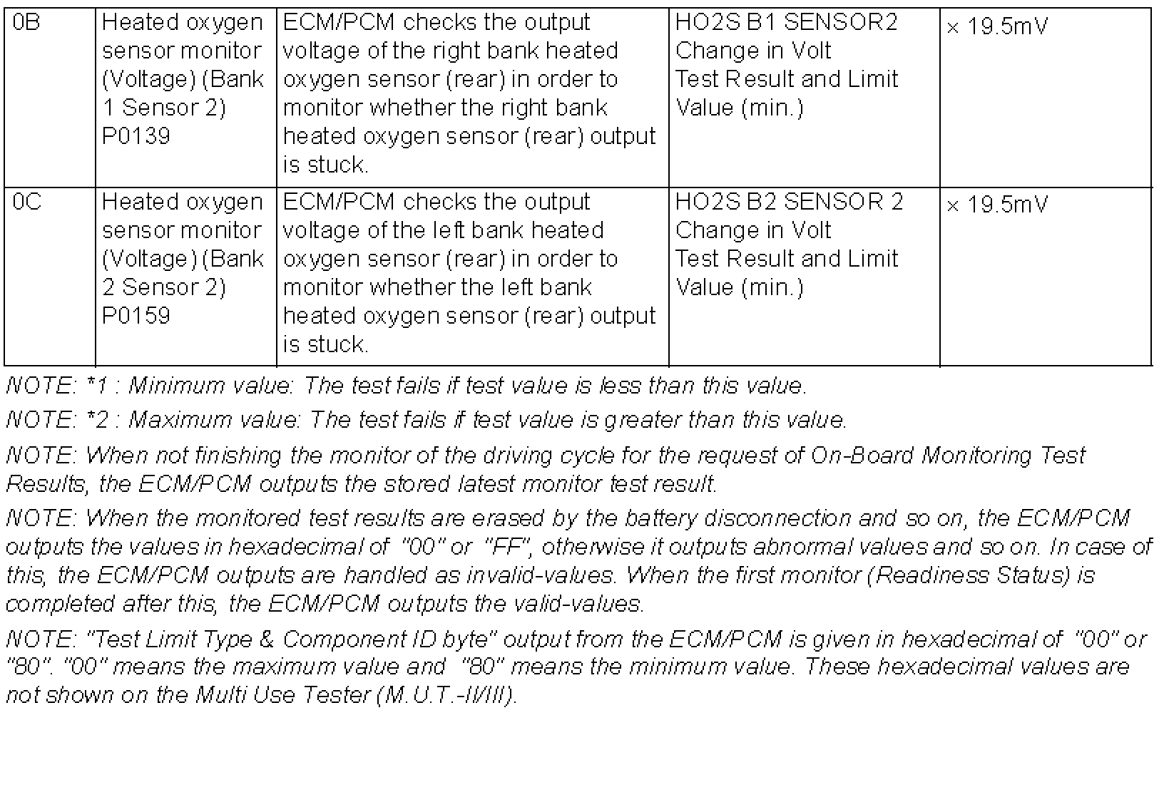 NOTE: By selecting MODE 06 using a scan tool, Test Result and Limit Value minimum (*1) or maximum (*2) about the main items of the emission control system, which the ECM/PCM monitors, can be confirmed. The value at the last monitoring is output by ECM/PCM as a test result.