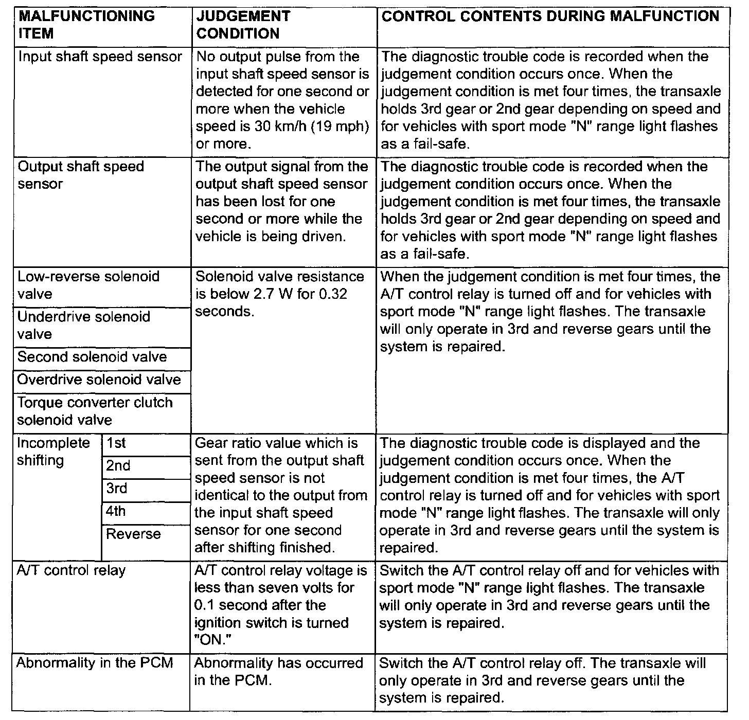 FAIL-SAFE/BACKUP FUNCTIONWhen malfunctions of the main sensors or actuators are detected by the PCM, the transaxle is controlled by pre-set control logic to maintain safe conditions for driving.