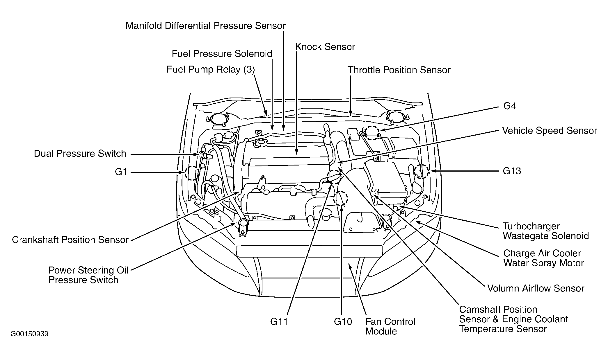 | Fan Control Module (2.0L Turbo) | On fan shroud, at left front of engine compartment. See Figure . |