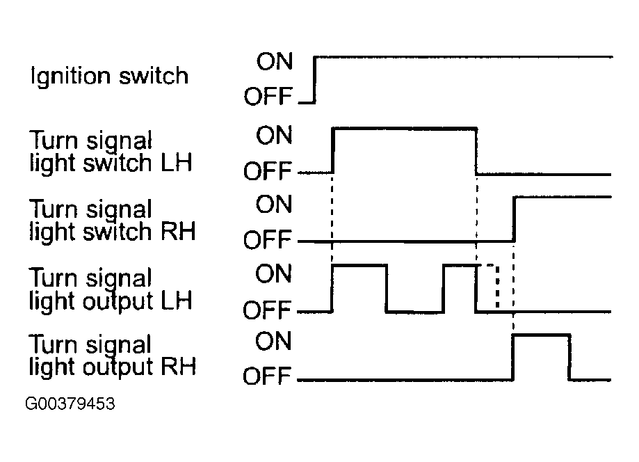 The turn signal light output (flashing signal) is turned ON when the turn signal light ignition switch is ON and the turn signal light switch is ON (LH or RH.) If the front turn signal light or rear turn signal light bulb has burned out, the flashing speed increases to indicate that the bulb has burned out. See Fig 1.