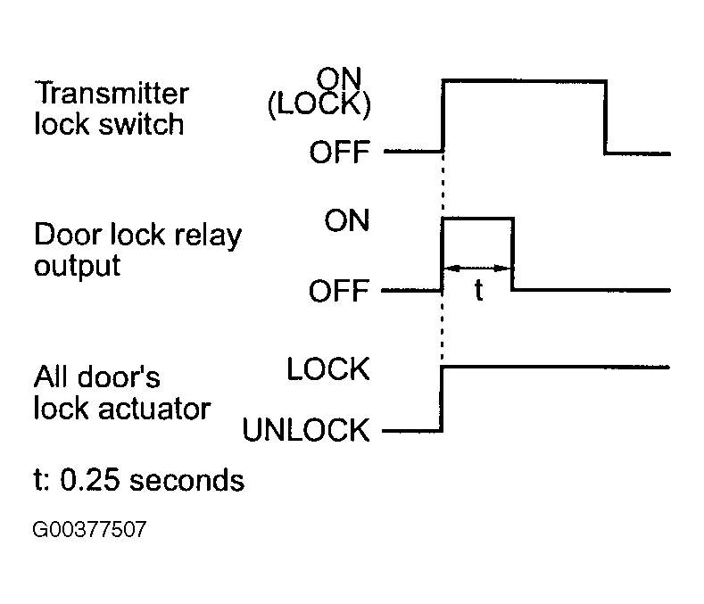 When the transmitter lock switch is pressed, the ETACS-ECU energizes its door lock relay to operate all the door lock actuators for 0.25 second thus causing all doors to be locked. See Fig 1.