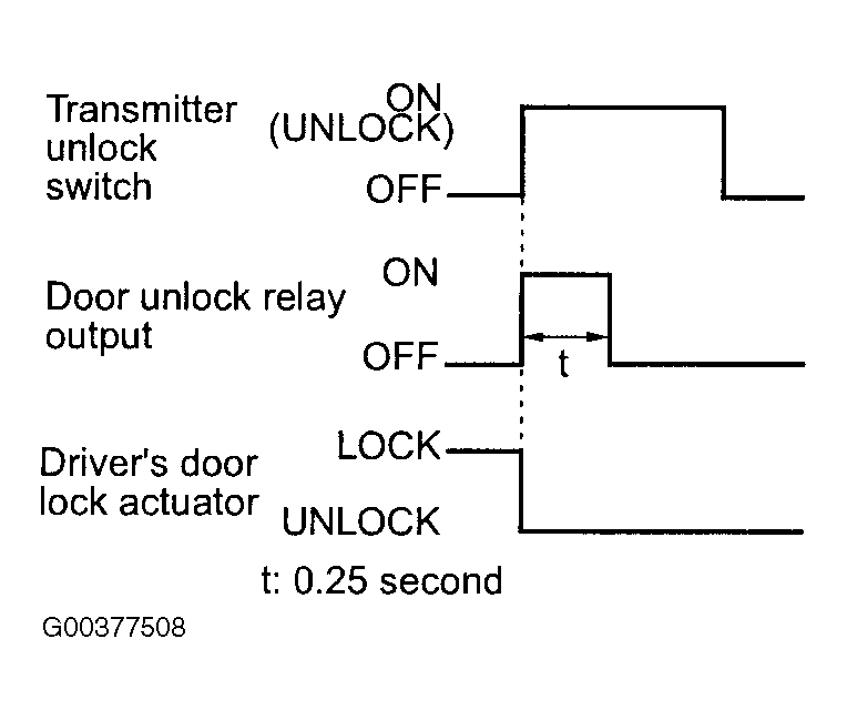 When the transmitter unlock switch is pressed once, the ETACS-ECU energizes its door unlock relay to operate the door lock actuator of the driver's door for 0.25 seconds thus causing only the driver's door to be unlocked. See Fig 1.