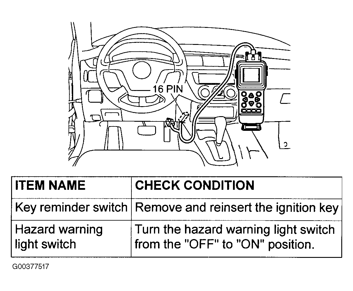 Scan tool MB991502 does not sound when the ignition key is removed and reinserted: See INSPECTION PROCEDURE N-1: ETACS-ECU DOES NOT RECEIVE ANY SIGNAL FROM THE KEY REMINDER SWITCH . Scan tool MB991502 does not sound when the hazard warning light switch is turned from "OFF" to "ON.": See INSPECTION PROCEDURE N-2: THE ETACS-ECU DOES NOT RECEIVE ANY SIGNAL FROM THE HAZARD WARNING LIGHT SWITCH .