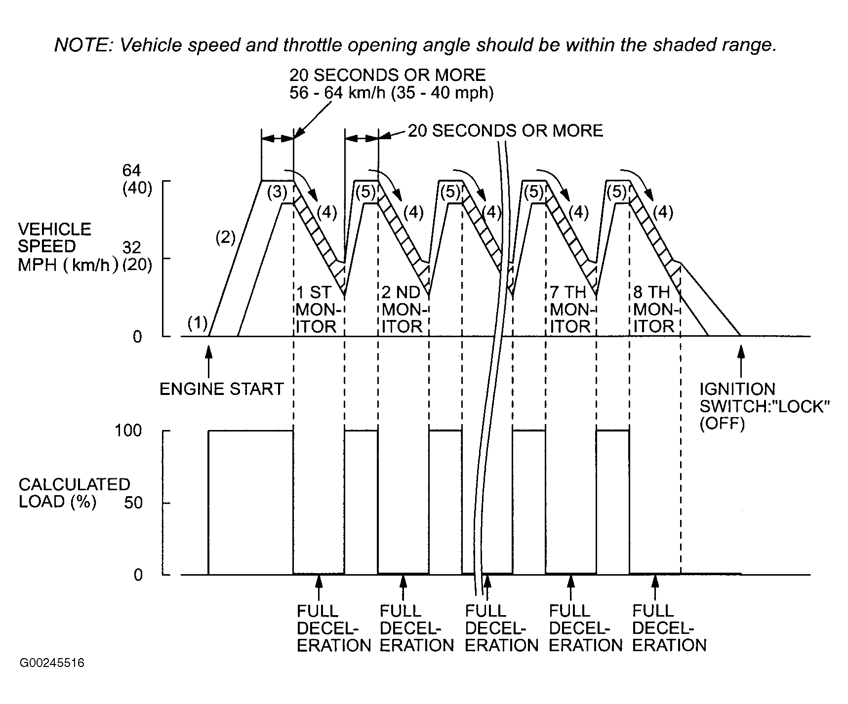 - Accelerate until the vehicle reaches 35-40 MPH (56-64 km/h), and travel for 20 seconds or more. Repeat steps 4 and 5 , completing 8 monitor sessions.