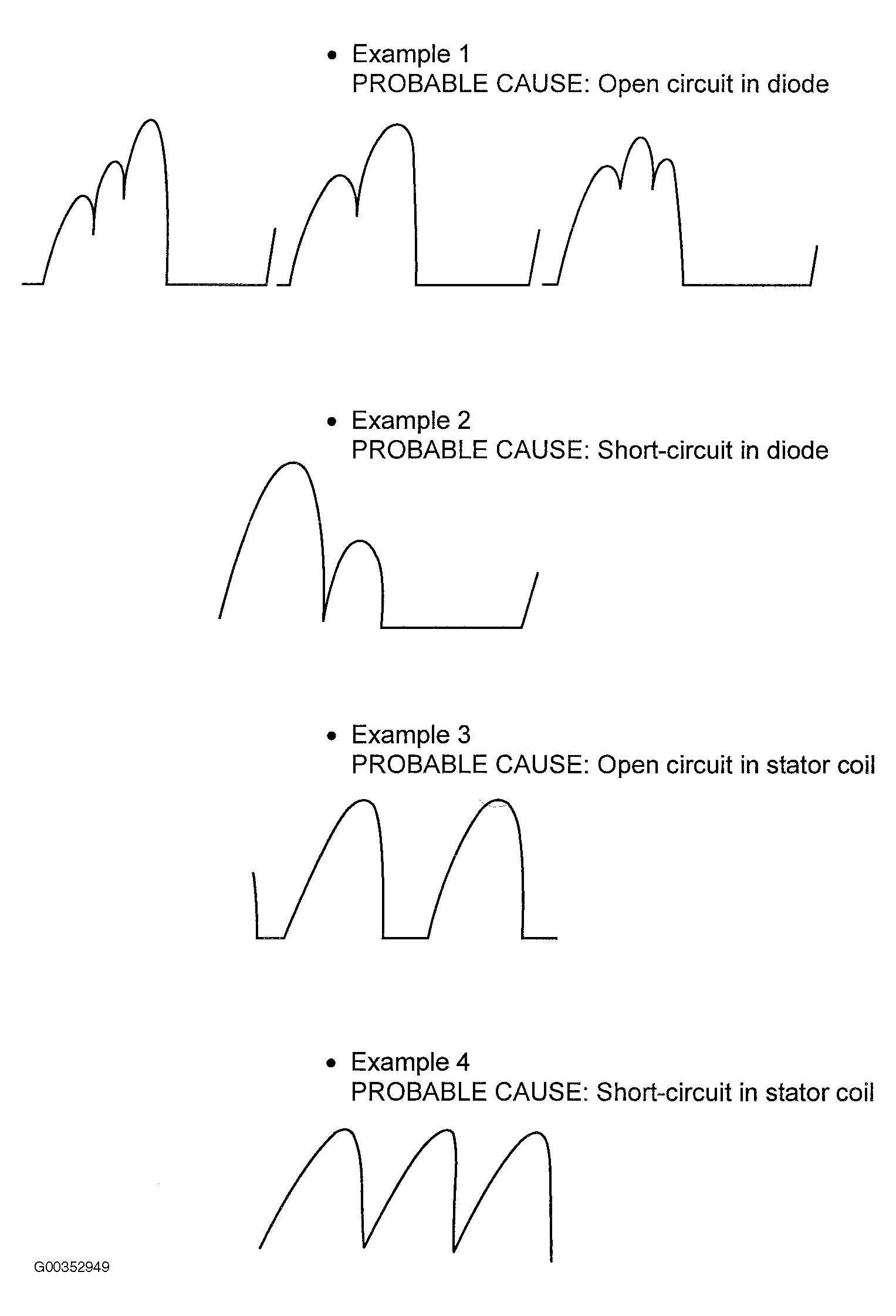 Identification of abnormal waveforms is easier when there is a large output current (regulator is not operating). Waveforms can be observed when the headlights are illuminated.