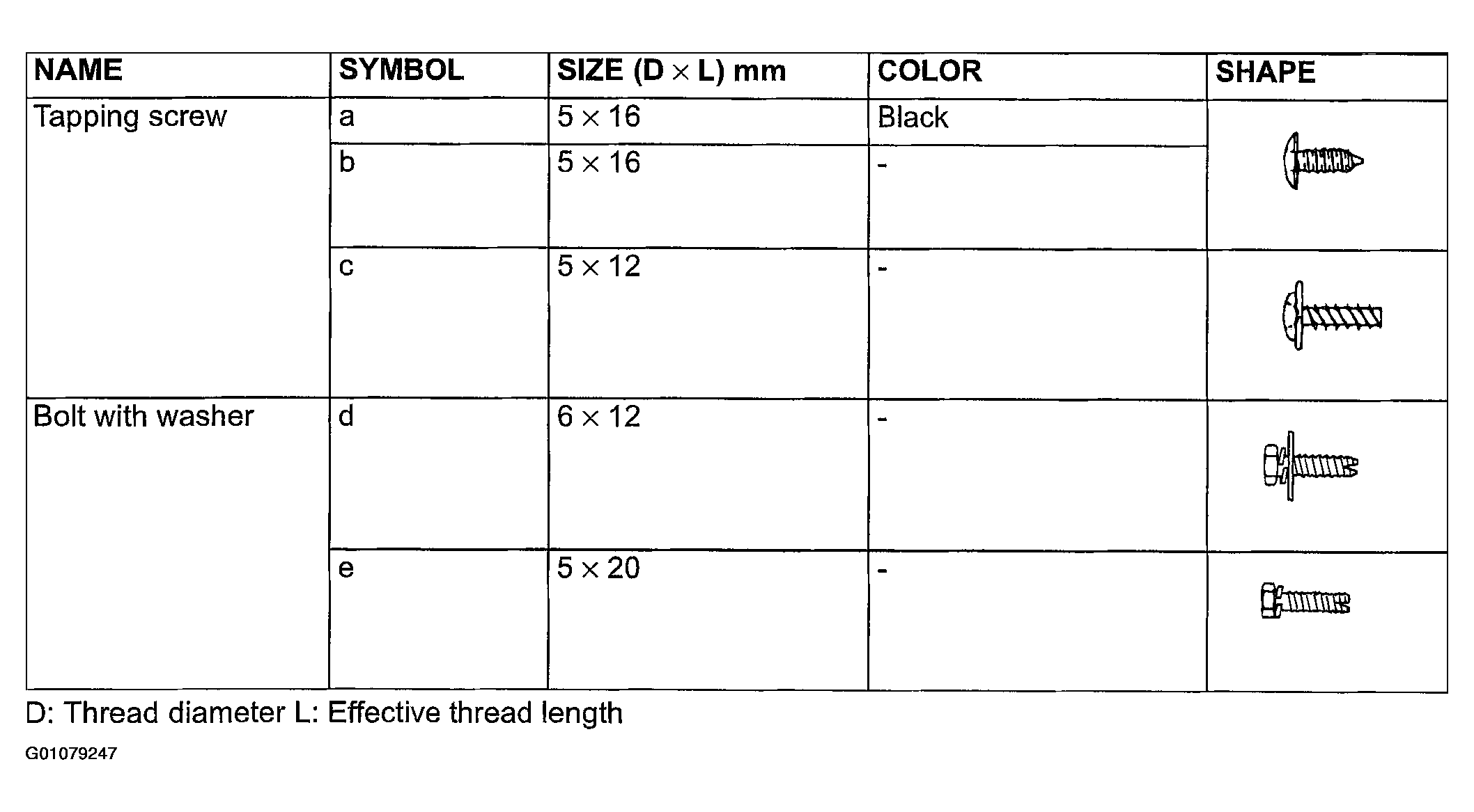 The following bolts and screws are used for installing the instrument panel. Bolts and screws are indicated as marks shown in Fig 1 .