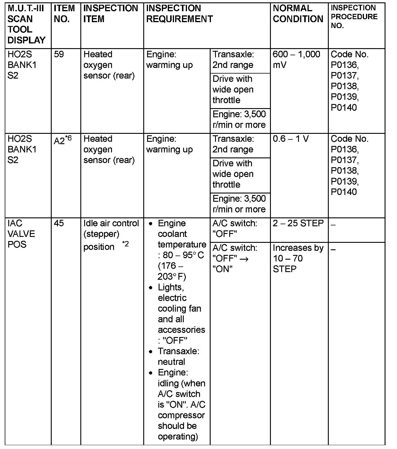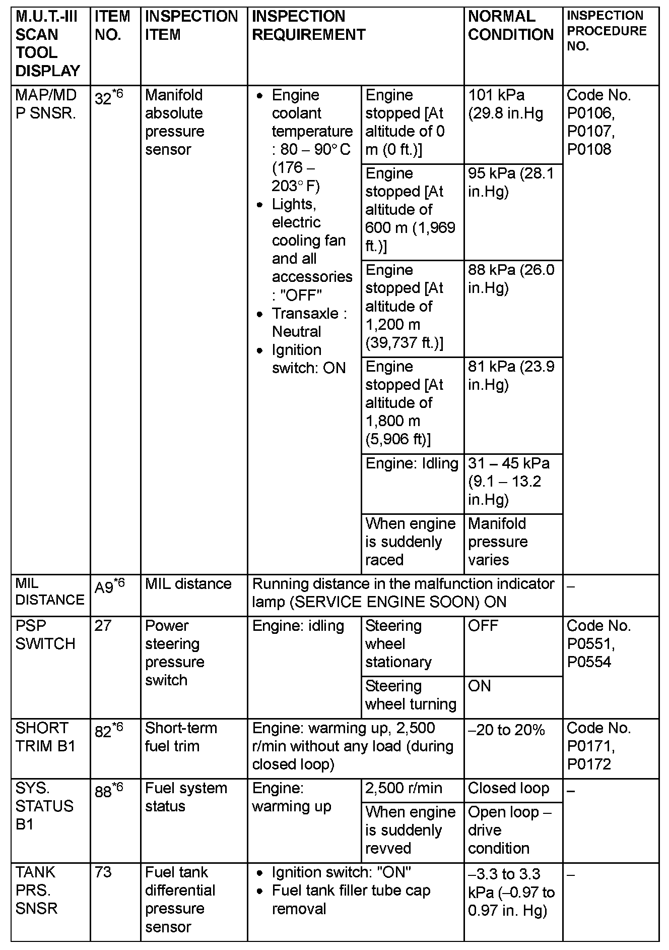 NOTE: *6: GST items. [Data list items consist of M.U.T.-III items and GST items. GST items can be accessed through the use of a general scan tool (GST). When scan tool MB991958 (M.U.T.-III sub assembly) is used, M.U.T.-III items appear alphabetically; then, GST items appear alphabetically. The black and white characters of the GST items are inverted from the M.U.T.-III items.]