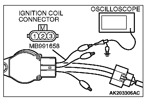 1. Disconnect the ignition coil connector and connect test harness special tool (MB991658) between the separated connector. (All terminals should be connected.)