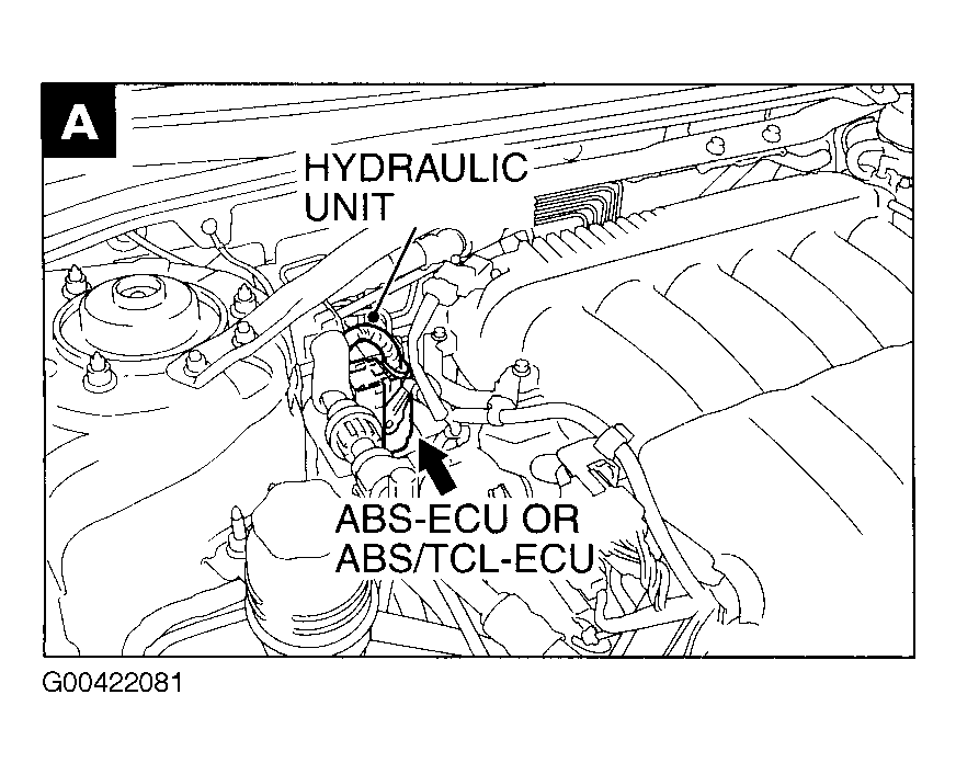ABS/TCL-ECU Right rear corner of engine compartment, on hydraulic unit. See Figure.