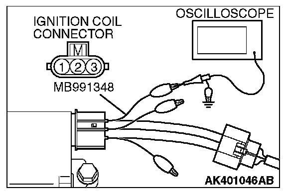 1. Disconnect the ignition coil connector, and connect test harness special tool, MB991348, in between. (All terminals should be connected.)