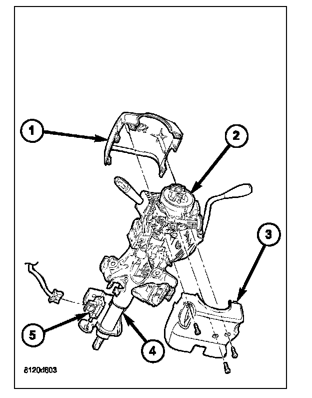 6. Remove the one center screw that secures the lower shroud to the steering column (4).