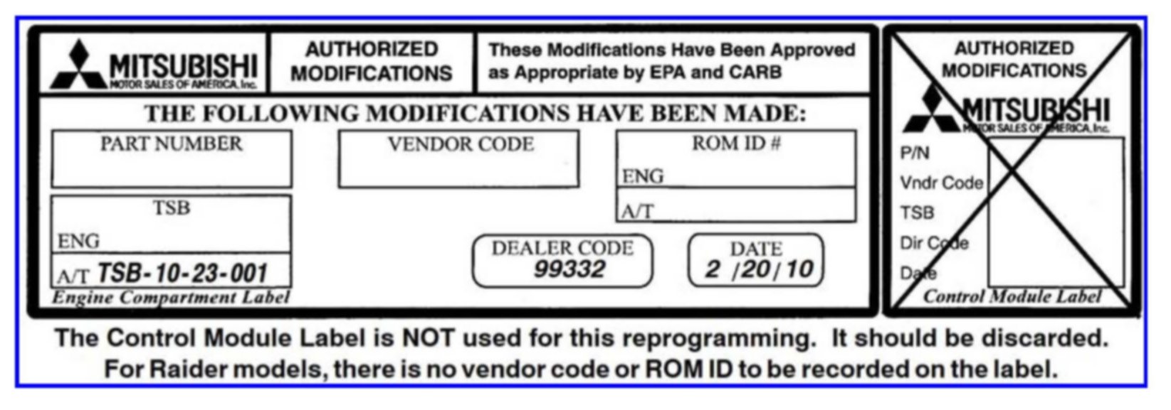 4. Using a ball-point pen, enter your dealer code, this TSB number (TSB-09-23-001) and the current date on the Engine Compartment / Control Module Label (part no. MSSF024G00). <