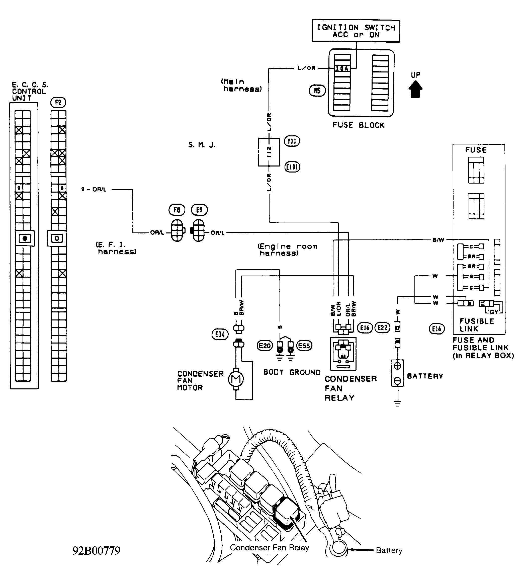 Warm engine to operating temperature. Engage A/C clutch using A/C switch in passenger compartment. Cooling fan should run. If cooling fan does not function as described, check power supplies, grounds, relay, radiator fan switch and motor. If no faults are found, check component wiring. See Figure .