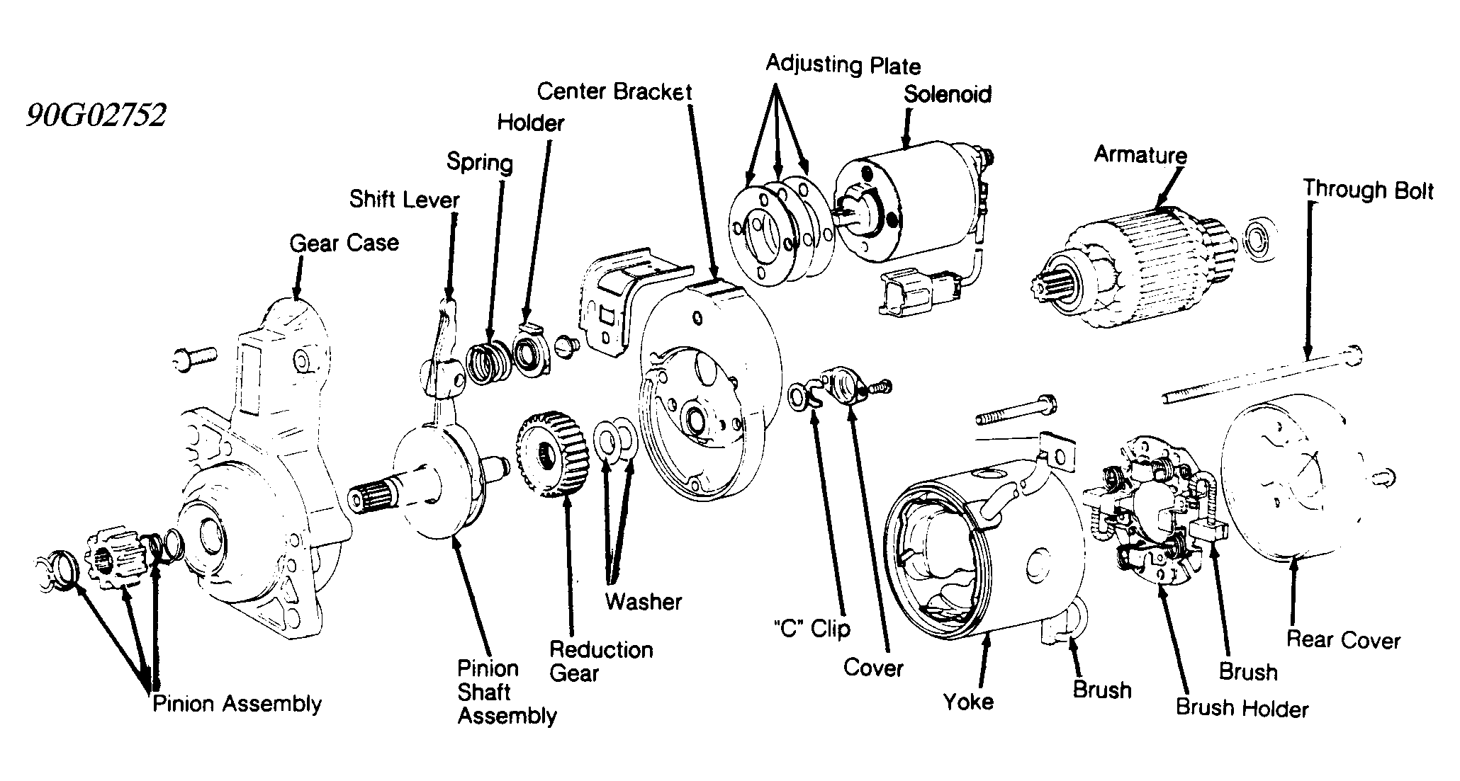 To adjust end play, some starters are equipped with adjusting plates (shims) or washers. See Fig 1-7 for exploded views of starters. Adjusting washers and plates are available in various thicknesses. Correct end play is .004-.020" (.1-.5 mm).