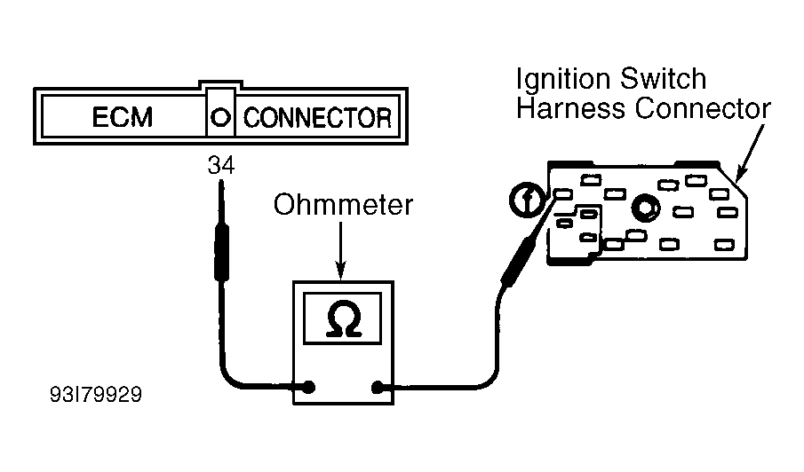 2. Turn ignition off. Disconnect ECM harness connector. Disconnect ignition switch harness connector. Check continuity between ECM harness connector terminal No. 34 (Blue/Black wire) and ignition switch harness connector terminal "f" (Red/Green wire). See Fig 1 . Continuity should exist. If continuity exists, check ECM and ECM harness connector terminals for correct installation, damage or corrosion. Repair as necessary. If continuity does not exist, repair open in harness or connectors between ignition switch and ECM harness connector. Check 10-amp fuse located in fuse box under left instrument panel. Repair or replace as necessary.
