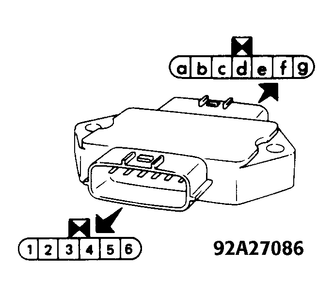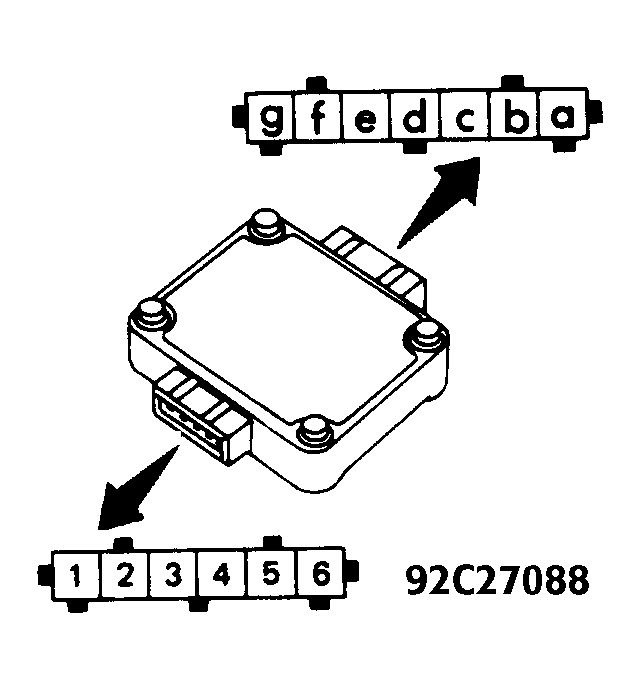 - Disconnect power transistor connector. Connect ohmmeter positive lead to terminal "g" and negative lead to terminals "a", "b", "c", "d", "e" and "f" of power transistor connector. See Fig 1