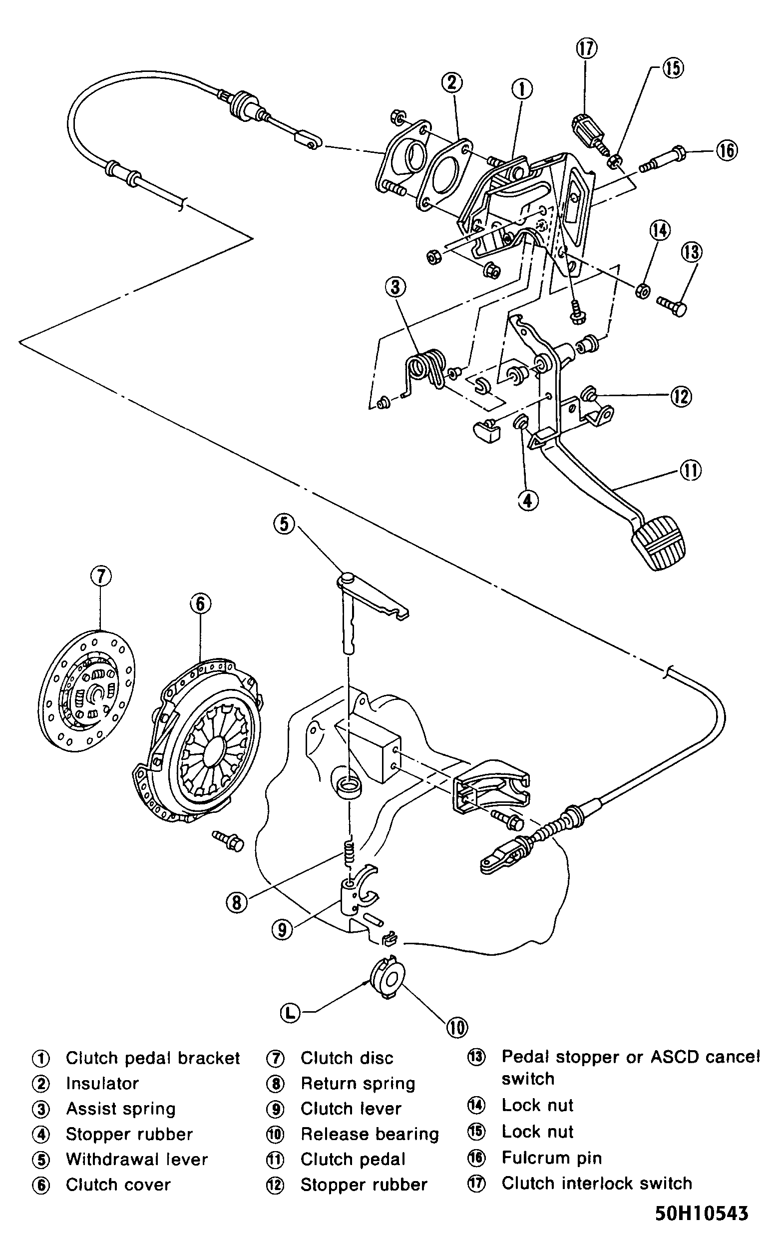 Clutch assembly is a single disc type with a diaphragm spring pressure plate. Sentra uses a mechanical control system consisting of clutch cable, release lever and release bearing. See Fig 1