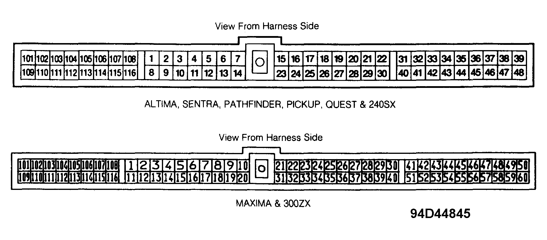 3. Ensure ignition is off. Disconnect ECM harness connector. Check continuity between ECM harness connector terminals No. 101 (White/Black wire), No. 103 (Green/Black wire), No. 110 (Yellow/Black wire), and No. 112 (Blue/Black wire) and corresponding injector harness connector wire color. ECM is located under center of instrument panel. See Figure . Continuity should exist. If continuity exists, check injector. See FUEL INJECTOR TEST. If injector is okay, check ECM pin terminals and ECM harness connector terminals for damage or corrosion. Repair or replace as necessary. If continuity does not exist, repair or replace harness or connectors.
