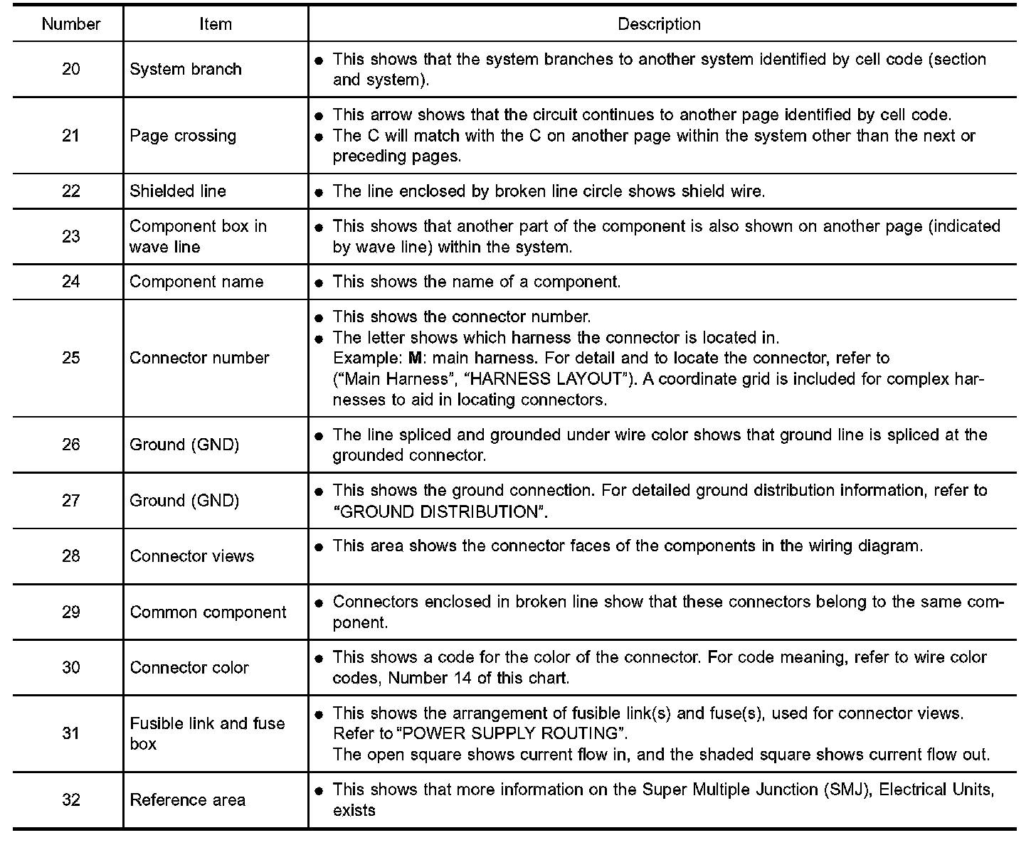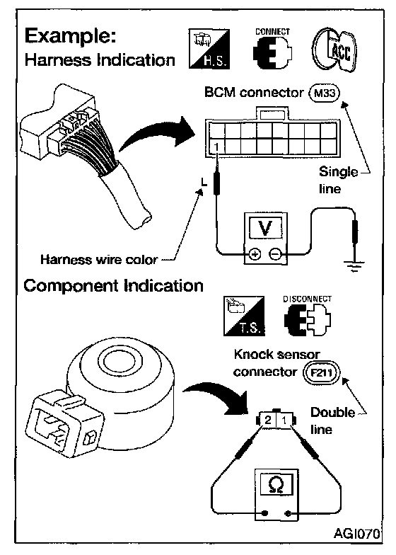- Connector symbols shown from the harness side are enclosed by a double line and followed by the direction mark.
