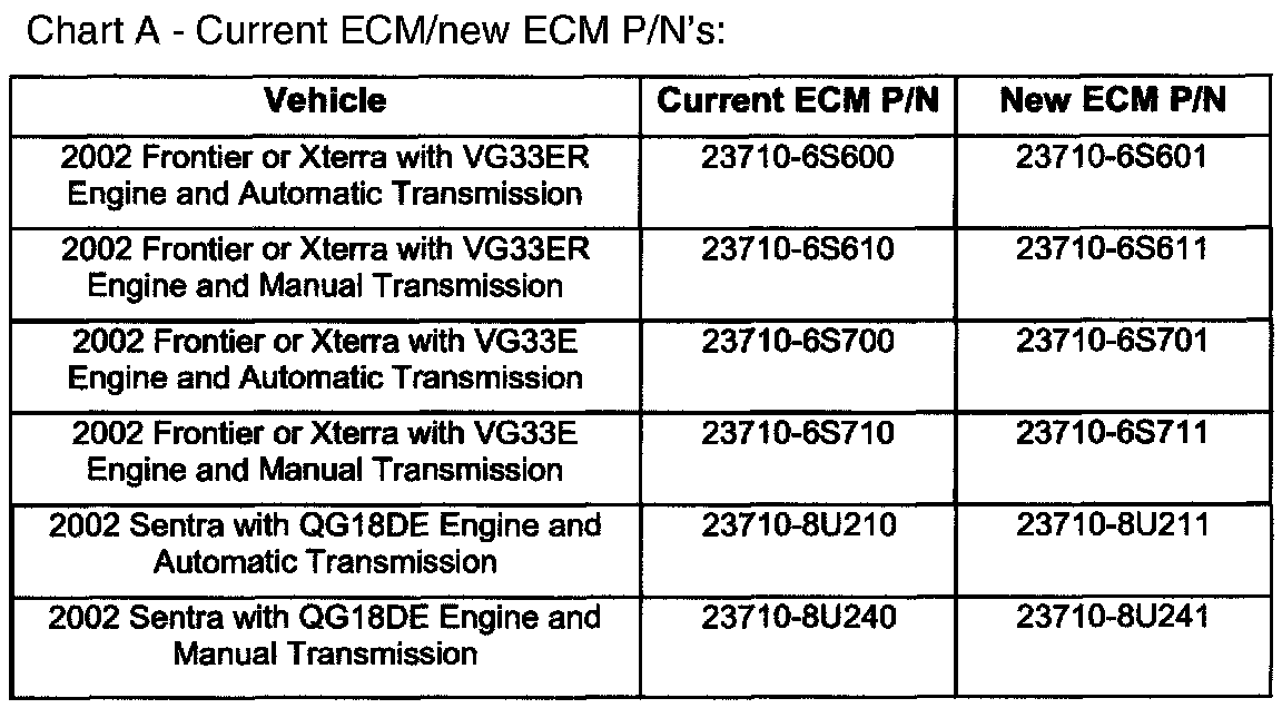 3. Compare the vehicle's ECM P/N to those shown under Current ECM P/N in Chart A.