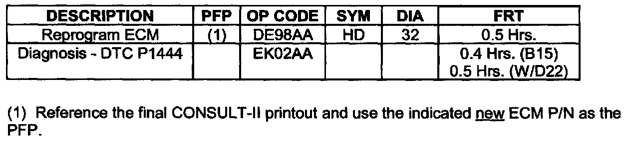 Use the Service Procedure provided in this bulletin to verify DTC P1444 and reprogram the ECM to the New ECM P/N listed in Chart A, above.
