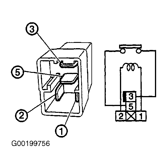 - Check the throttle control motor relay. See Fig 3. With a fused jumper wire connect relay terminal No. 1 to battery positive. Using another jumper wire, connect terminal No. 2 to battery negative. In this condition continuity should exist between terminals No. 3 and 5. With voltage removed from terminals No. 1 and 2, continuity should not exist. If relay does not check as specified, replace relay and perform DTC CONFIRMATION TEST to verify repair. If relay is OK, go to next step.