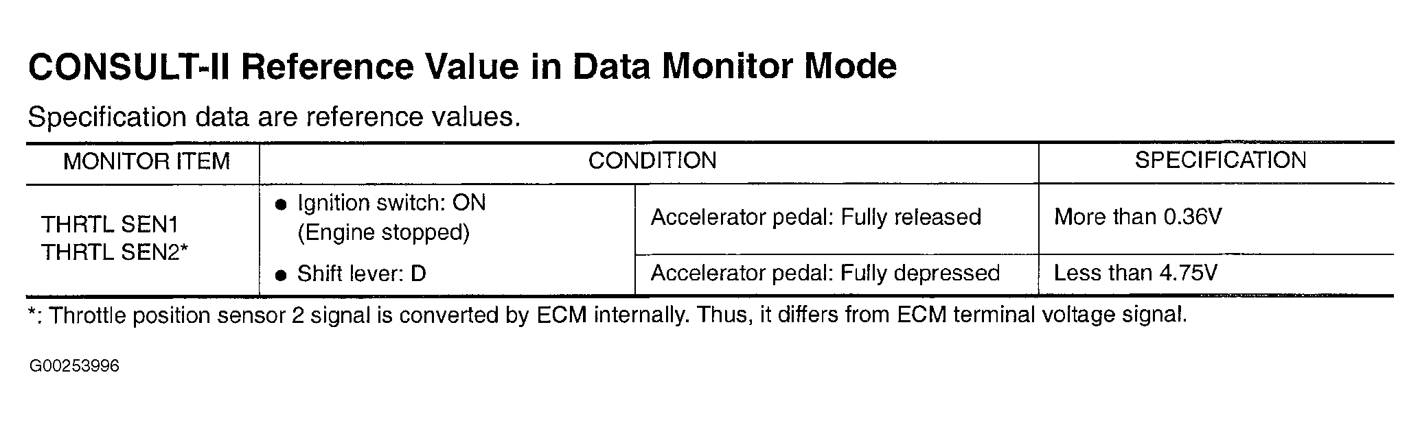 Home >> Nissan-Datsun >> 2002 >> Sentra SE-R, Automatic >> Repair and Diagnosis >> External Pages >> Different car >> Section 190 (Engine Controls - Self-Diagnostics) >> Diagnostic Tests >> DTC P0122 & DTC P0123: Throttle Position Sensor >> CONSULT-II Reference Value In Data Monitor Mode