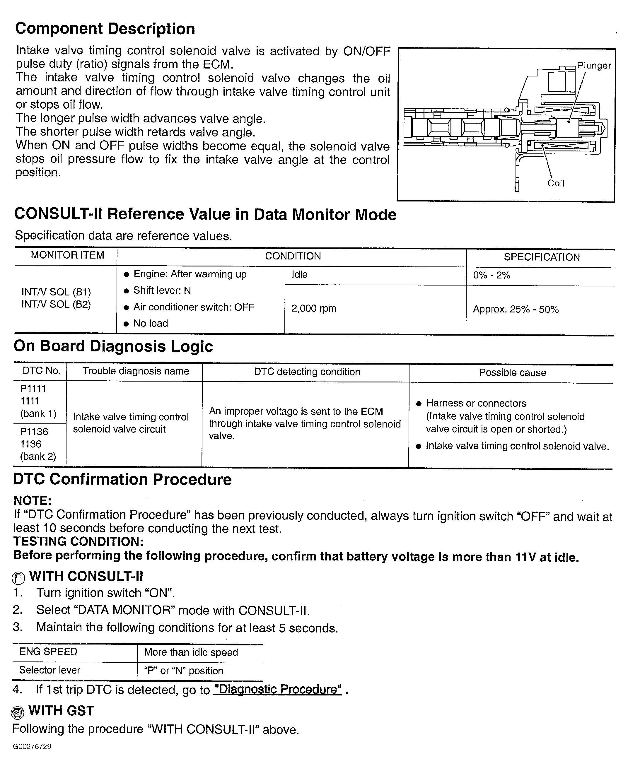 Component Description, CONSULT-II Reference Value In Data Monitor Mode, On Board Diagnosis Logic & DTC Confirmation Procedure