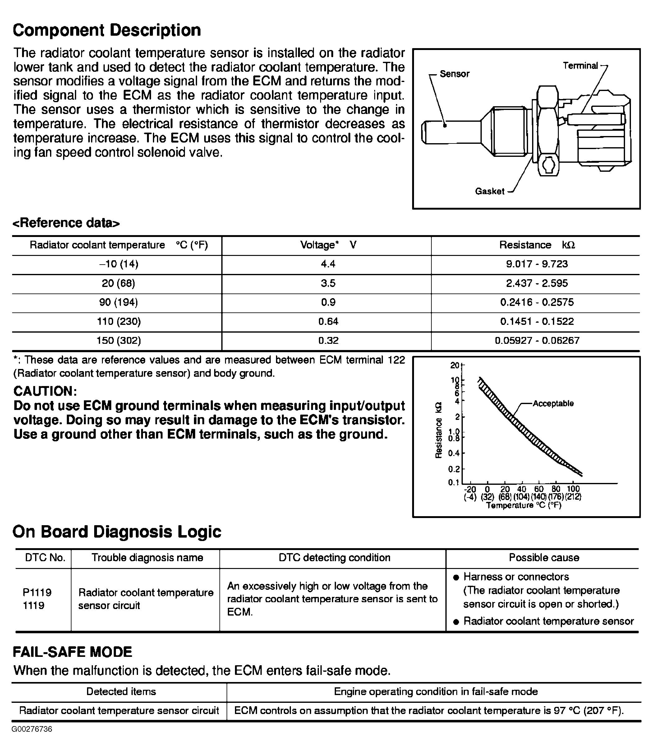 Home >> Nissan-Datsun >> 2002 >> Sentra SE-R, Automatic >> Repair and Diagnosis >> External Pages >> Different car >> Section 190 (Engine Controls - Self-Diagnostics) >> Diagnostic Tests >> DTC P1119: Radiator Coolant Temperature Sensor (Circuit) >> Component Description, Reference Data, On Board Diagnosis Logic & Fail-Safe Mode