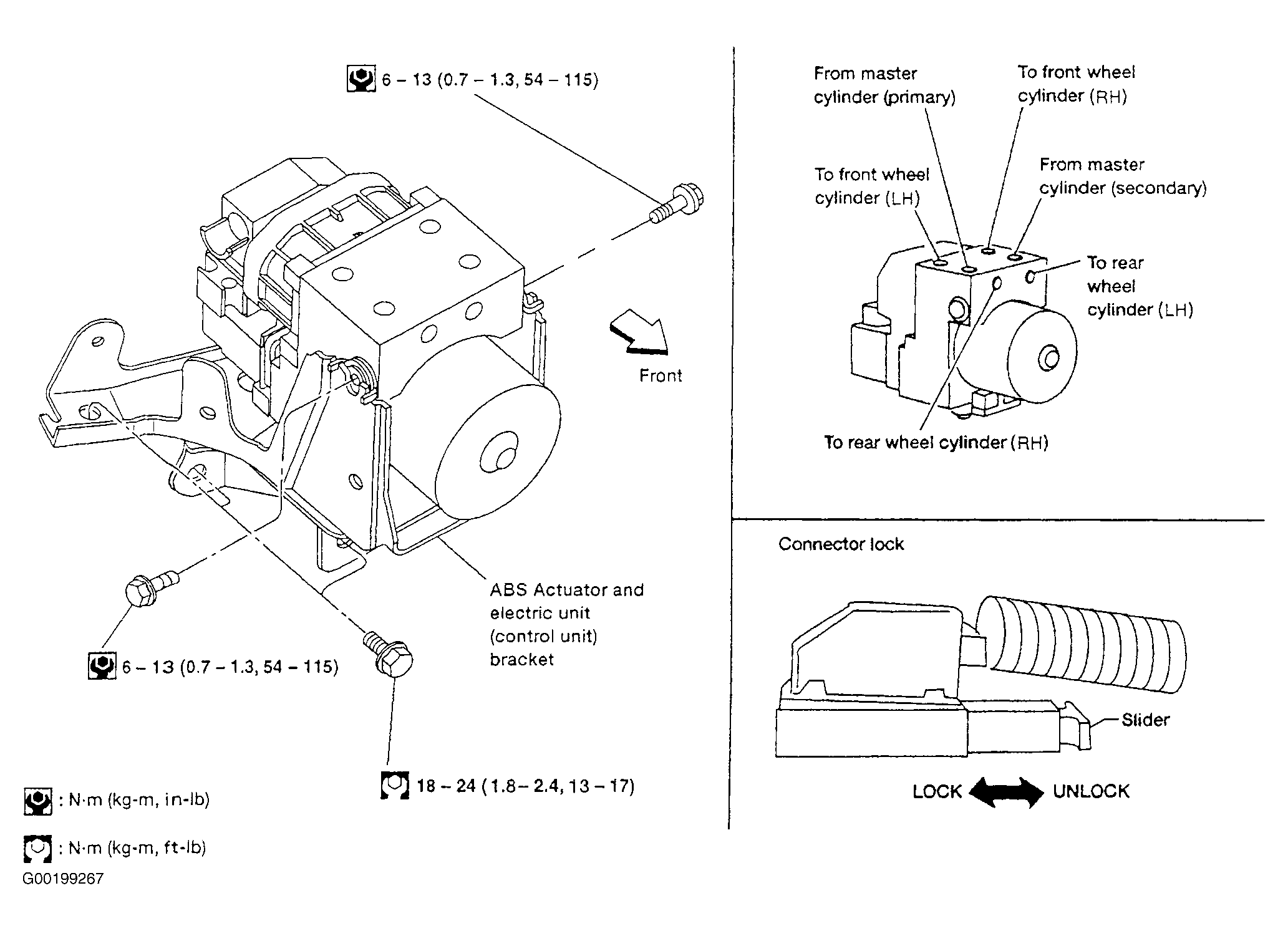 Disconnect negative battery cable. Drain brake fluid from brakelines. Mark brakelines for installation reference. Remove the A/C high pressure and A/C low pressure lines. See REMOVAL AND INSTALLATION . Disconnect wiring harness and brakelines. Remove actuator mounting nuts and bolts. See Fig 1 . To install, connect brakelines without tightening. Install and tighten actuator mounting nuts. Tighten brakelines. See TORQUE SPECIFICATIONS . After installation, add brake fluid and bleed brakelines. See BLEEDING BRAKE SYSTEM .