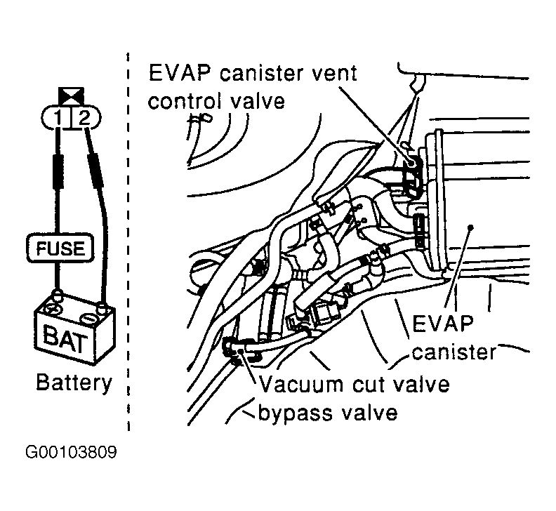8. Turn ignition off. Disconnect EVAP-CVCV and vacuum cut valve by-pass valve harness connectors. See Figure . Using jumper wires, apply battery voltage to EVAP-CVCV and vacuum cut valve by-pass valve terminals. See Figure . Apply 0.2-0.4 psi (1.38-2.76 kPa) of pressure to EVAP service port. DO NOT exceed 0.6 psi (4.12 kPa) of pressure. Remove pressure pump from EVAP service port. Using Leak Detector (J41416), locate EVAP system leak. See VACUUM DIAGRAMS article. If a leak is found, repair as necessary. If no leak is found, go to next step.