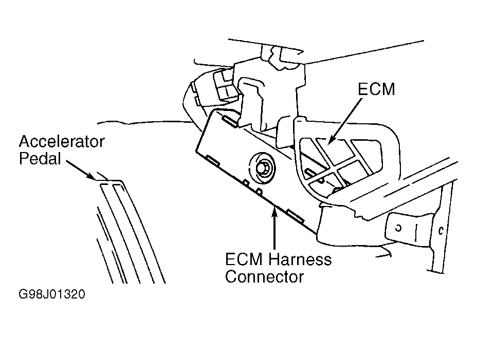 - Turn ignition off. Disconnect ECM 124-pin harness connector. ECM is located below instrument cluster. Remove lower instrument panel to access ECM. See Figure. Check continuity between ground and ECM harness connector terminals No. 10, 19, 116 and 124 (Black/Red wire). See Figure. Check continuity between ground and ECM harness connector terminals No. 25 and 32 (Black/Yellow wire). Continuity should exist at all measurements. Also, check circuits for short to voltage. If problem is found, go to next step. If no problem is found, go to step 15.