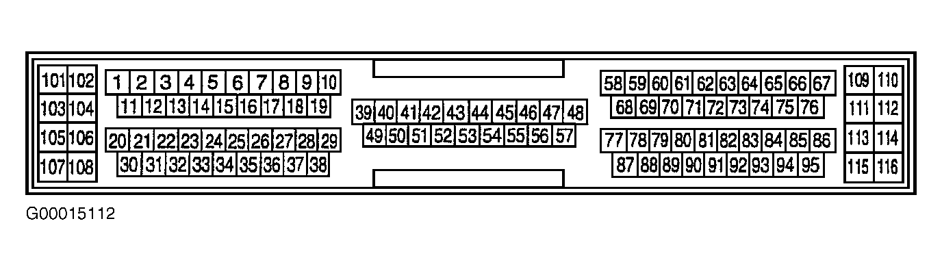 - Turn ignition off. Disconnect ECM 116-pin harness connector. ECM is located under instrument panel. Check continuity between ground and ECM harness connector terminals No. 48, 57, 106 and 108 (Black wires). See Figure. Continuity should exist. Also, check circuits for short to voltage. If problem is found, repair as necessary. After repair, retest system.