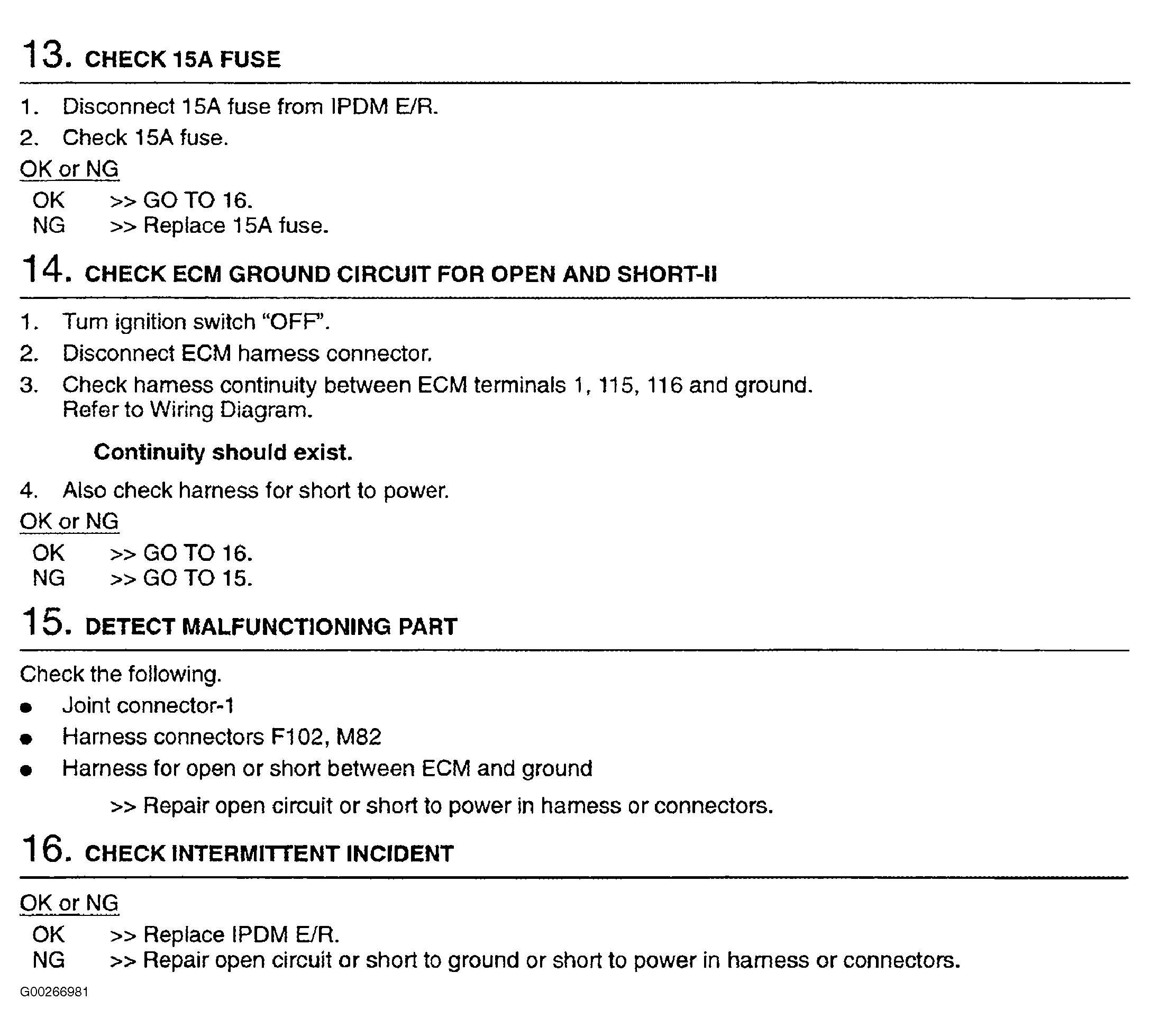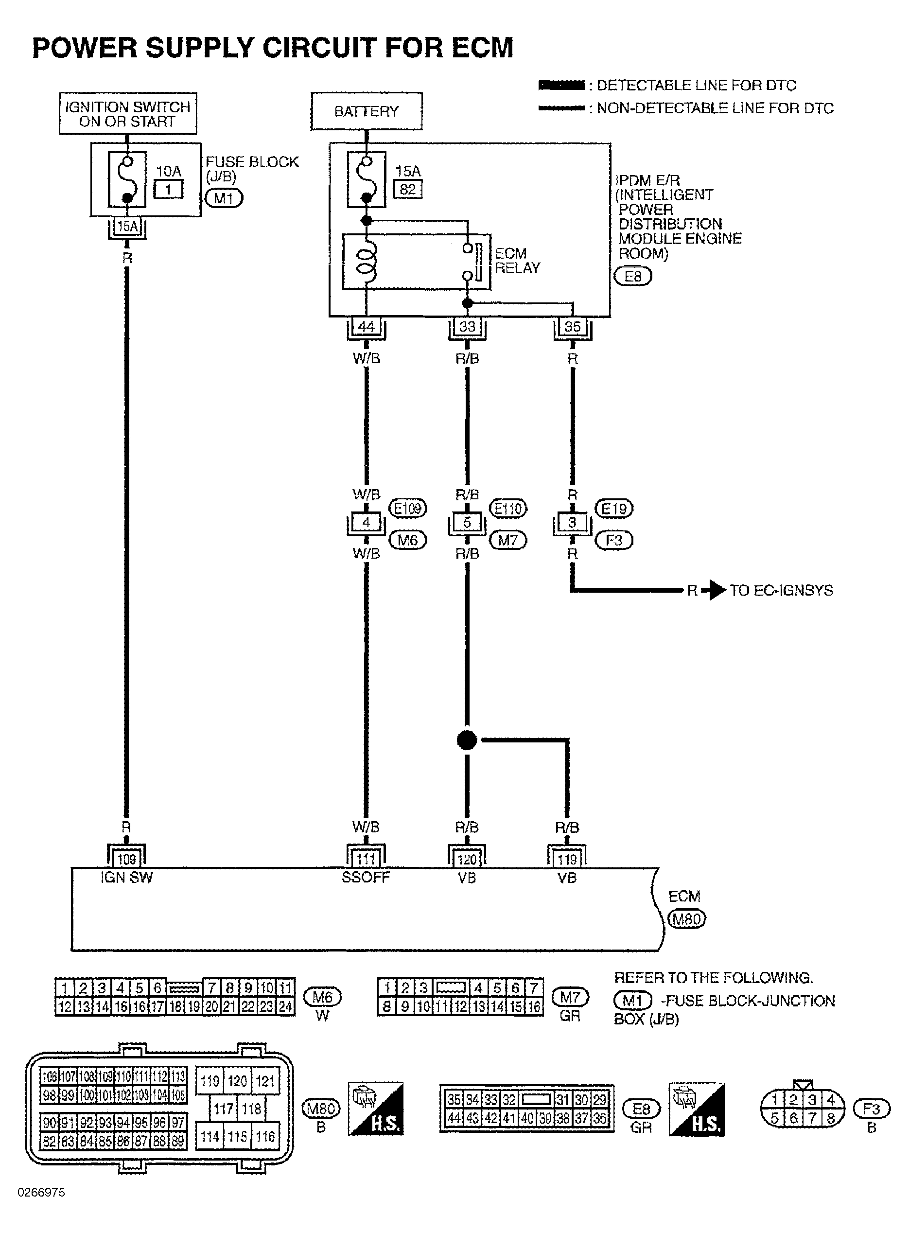 For ECM power and ground circuit wiring diagram and diagnostic procedure, see Fig 1-Fig 7 . If no problem is found, check ignition signal. See IGNITION SIGNAL CIRCUITS under IGNITION SYSTEM. For intermittent diagnosis, see INTERMITTENTS in TROUBLE SHOOTING - NO CODES article.