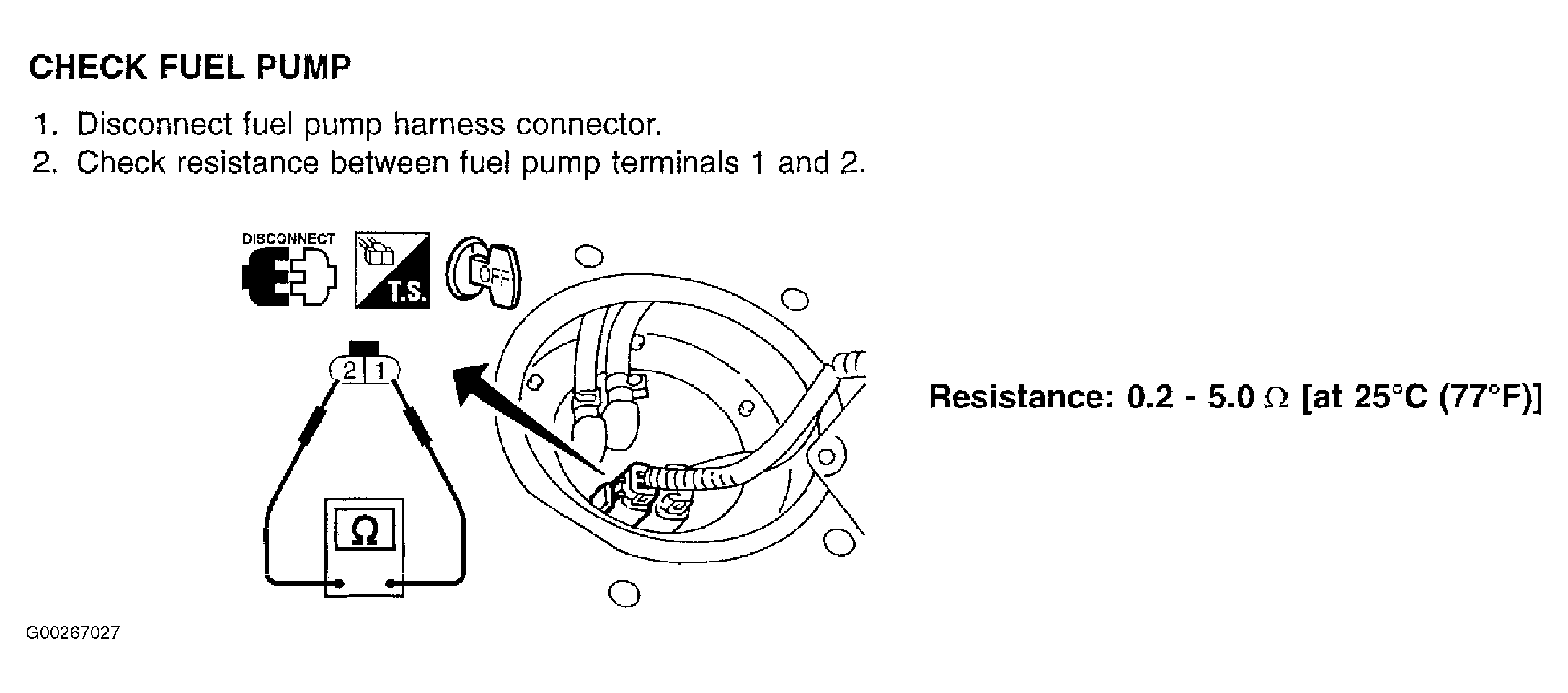 Disconnect fuel pump harness connector. For location, see FUEL PUMP HARNESS CONNECTOR LOCATIONS table. On Frontier 2.4L, measure resistance between fuel pump connector terminals No. 5 and 6. See Fig 1. On Maxima and Sentra, measure resistance between fuel pump connector terminals No. 1 and 3. See Fig 2. On all other models, measure resistance between fuel pump 2-pin connector terminals See Fig 3. On all models except Murano and 350Z, resistance should be 0.2-5.0 ohms at 77°F (25°C). On Murano and 350Z, resistance should be approximately 1.0 ohms at 77°F (25°C). Replace fuel pump, if resistance is not as specified.