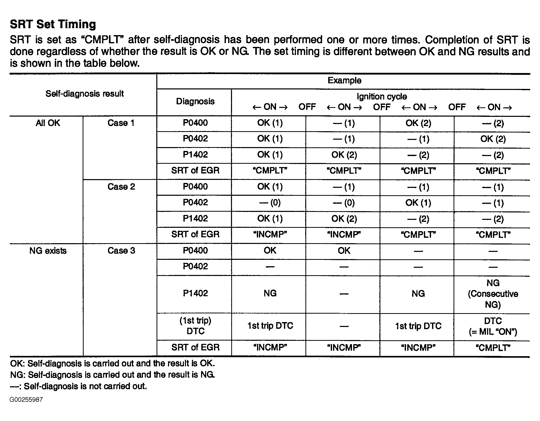 Home >> Nissan-Datsun >> 2003 >> Sentra SE-R, Automatic >> Repair and Diagnosis >> Engine Performance >> System >> Engine Controls - Self-Diagnostics (Qr25DE) >> Drive Cycles >> System Readiness Test (SRT) Code >> SRT Set Timing