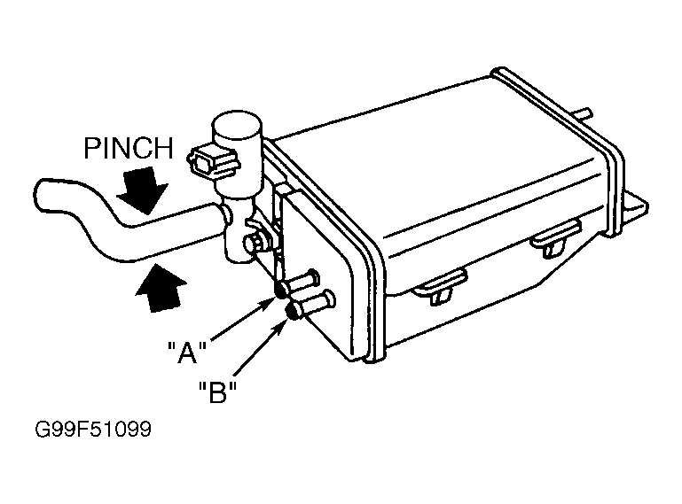 Remove EVAP canister. Plug vent hose and blow air into port "A". Air should flow freely out of port "B". See Fig 1. Replace EVAP canister, if operation is not as specified.
